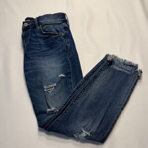 Stylish distressed blue jeans perfect for casual outings. Comfortable fit with a trendy look. Measurements in photos.