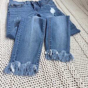 These Express Skinny Distressed Cropped Legging Mid-Rise Women's Jeans Size 0 are in great condition! The bottom fringe these jeans have is absolutely adorable! For reference, I am 5' 6" and 126 lbs. Please see pictures for material info.