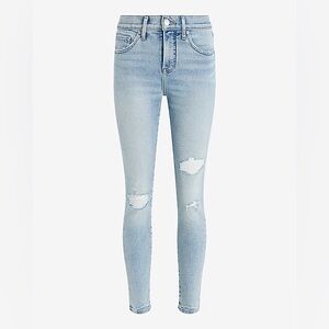These blue skinny jeans from Express feature a high-waisted design with stylish distressed details at the knees. The light wash denim offers a modern, casual look perfect for everyday wear.