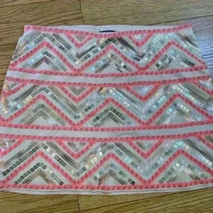 Express Skirt. Size S/P. Beautiful cream color mini with coral pattern. Rose gold sequin design. 13 1/2 inches from waist to hem. SKU#60