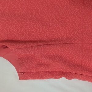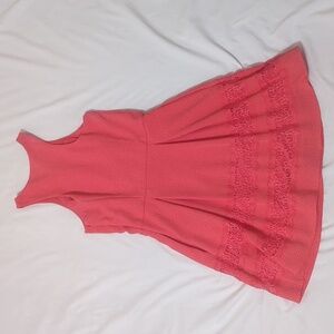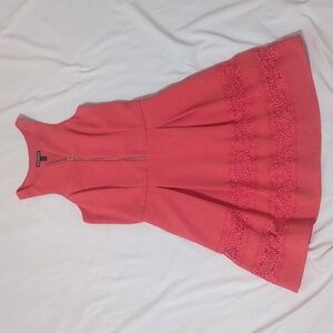 Super cute dress from the brand Express! Color is a bright pink/coral color. Dress is lined and features a lace pattern on the skirt. Also has a zipper on the front of the dress and has a hidden zipper on the side. Oh, and did we mention it also has pockets!!