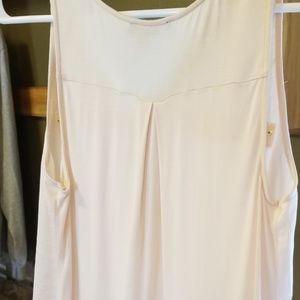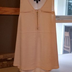 EUC! Off White/Cream/VERY light Beige or VERY pale pink like color (pretty color but hard to describe). Really, really pretty. Sleeveless. Zipper is gold and gold grommet each corner of faux front pockets. Front of blouse is a sheer overlay like and the same color lining/back. Measurements are about: armpit to armpit: 18 - 18 1/2 ", Length about 25". front material 100% polyester and Back is 100% Rayon