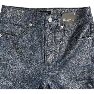 Stylish and eye-catching denim pants with a unique metallic finish. These jeans from Express offer a slim silhouette with a super high rise, perfect for accentuating the waistline. The metallic detailing adds a touch of edgy sophistication, making them versatile enough for both casual and dressy occasions. These jeans feature a classic five-pocket design and a comfortable fit. Pair them with a simple tee and sneakers for a chic daytime look, or dress them up with a blouse and heels for a night out. Perfect for a holiday party, a date night, or any occasion where you want to make a statement.