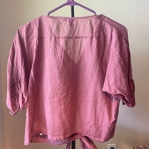 This top is a little see through. But can be used for a coverup over a bathing suit or even with an under shirt. It’s more of a maroon type color. This top has only been worn once.
