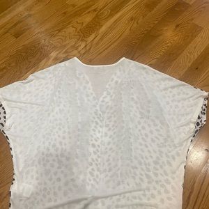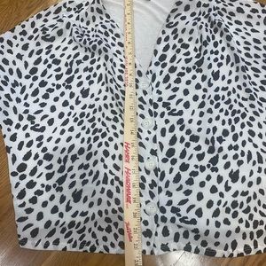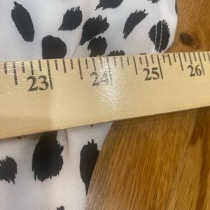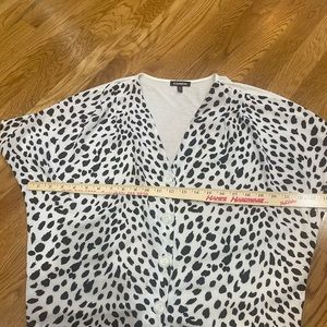 Express. Small. Boxy look. Workable buttons. Super cute and comfy. Too big for me now.
