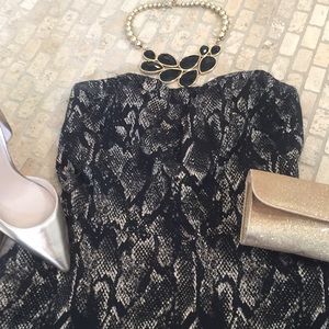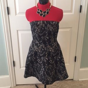 Beautiful black and gold snake print strapless dress. Very fitted at the waist with flare A-line skirt.