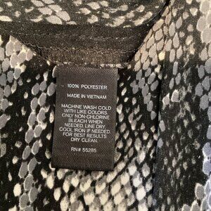 This Express jumpsuit features a unique snake print design on a multicolor neutral grays and black background, with a pullover closure and elastic waist for a comfortable fit. It comes in size XS and has a straight leg style with a 26.5 inch inseam. The jumpsuit is made of lightweight polyester material and is machine washable for easy care. It also includes pockets and is perfect for summer or spring occasions, whether you're traveling, going to a party, or just running errands casually. The jumpsuit has a contemporary modern mod and bohemian theme, with animal print and snakeskin print elements.