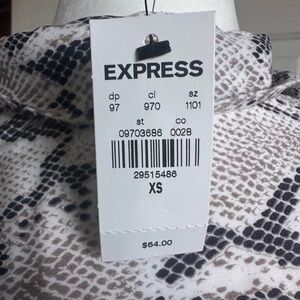 Add a bold yet versatile piece to your wardrobe with this Express Snakeskin Print Button-Down Tunic Shirt in size XS. This brand new with tags (NWT) blouse originally retailed for $64. Features a trendy snakeskin print, long sleeves with buttoned cuffs, a classic collar, and a high-low hem for an effortlessly stylish look. Perfect for work or casual outfits!