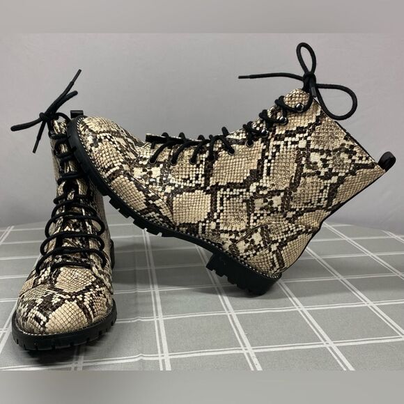 Express Snakeskin Print Lace Up Combat Boot Side Zip with Top of Rubber Soles Encrusted with Rhinestone Accents Womens Size 9 See Photos: very nice pre-owned condition