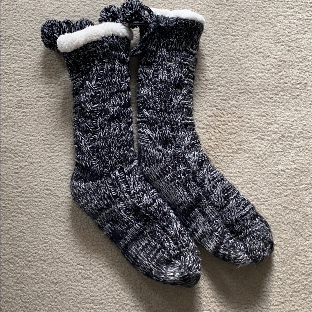 Express Socks. Black and white with silver flec. Pom Pom detail at top of sock. These are meant to be worn indoors as a substitute for slippers. Very warm. Washable. Anti-skid dots on bottom. There is no size that I can see on these but I am a size 9 and these fit perfectly.