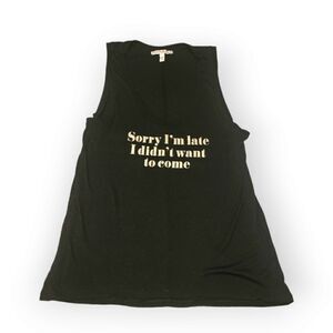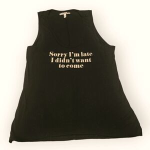 Perfect for the introvert in you that would much rather relax at home than make an appearance. This Express Sorry I'm Late I Didn't Want to Come Black Tank Top (Size M) is a cute casual and sure to be a conversation starter. Super comfy!