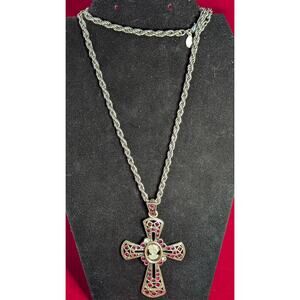 Express Statement Cross Necklace Red Rhinestone Cameo Pendant Rope Chain