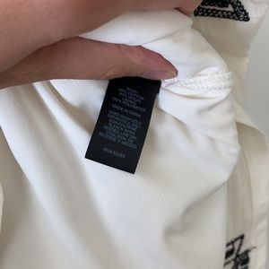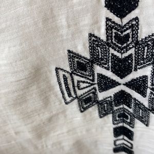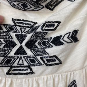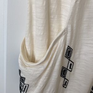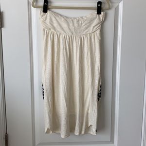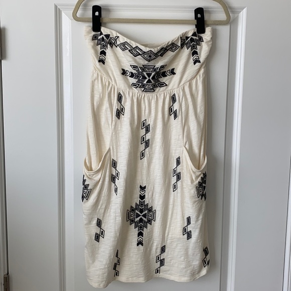Super cute and comfortable aztec patterned strapless mini dress with 2 POCKETS and a built in liner!!! Cream color with black pattern (stitching and a little sequin). Drop hem in back making the back slightly longer than the front. Perfect spring/summer dress!! gently worn condition - small spot in back that’s barely noticeable unless looking up close. Small stain on inside of liner that’s not visible when wearing.