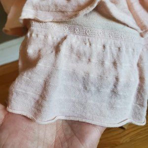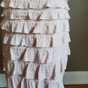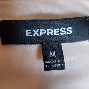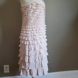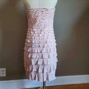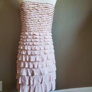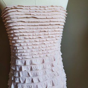 This Express strapless dress looks like rose. The layers are blush colored and overlay like flower petals. The layers of fabric start small continually graduating to larger and larger layers to the bottom hem. There are no zippers or openings, the chest is elasticized. Mini silhouette, lined, size medium. Gently worn and in very good condition.