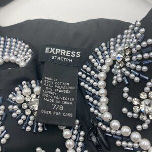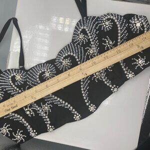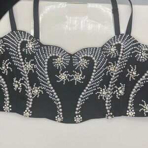 Purchased this new , Bustier bra top , size 7/8 Medium has handsewn glass pearls and Swarovski crystal stones , the side zips up, the straps are adjustable. This top is stunning with a pair of black leather pants. Only been worn twice