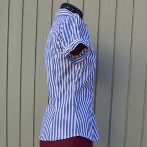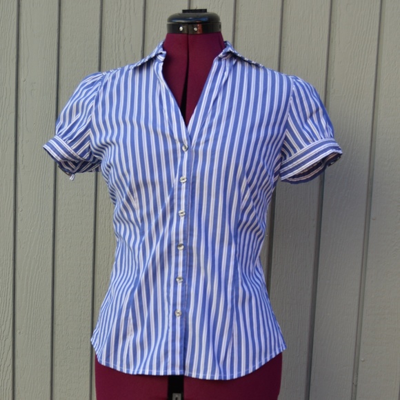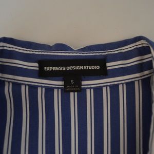 Express Design Studio button down fitted blouse with collar. Silver buckle accent on sleeves. Blue & white vertical stripes