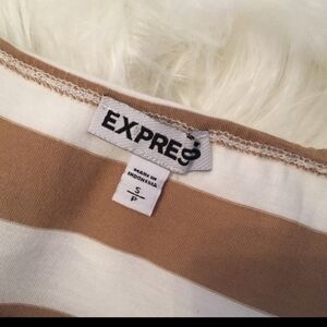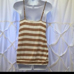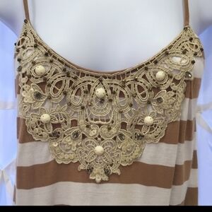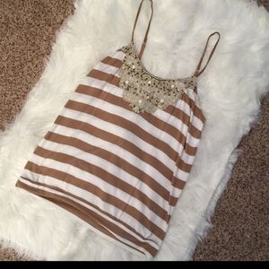 NWOT brown and white striped cami tank with adjustable spaghetti straps, banded bottom hem, and bead, sequin, and rhinestone embellished neckline.