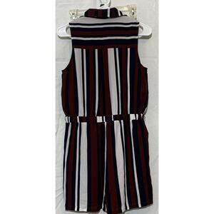 Cute striped romper size small. Has collar with v-neck and elastic waistband. Colors are burgundy, navy and white.