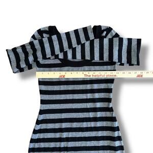 Classic striped sweater dress by Express. Designed in a sleek black and gray horizontal stripe pattern, this dress features a flattering scoop neckline, long sleeves, and a body-hugging silhouette that works perfectly for layering or wearing alone. Size XS – please see measurements for best fit.