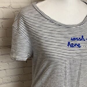 Express striped short sleeve tee with the words "wish you were here" embroidered on with blue stitching. Rhinstone details for the i and periods. Wide crew neckline. Good used condition. Size medium.