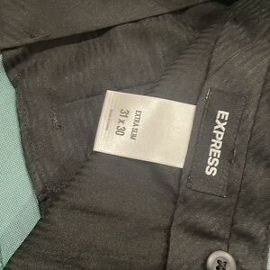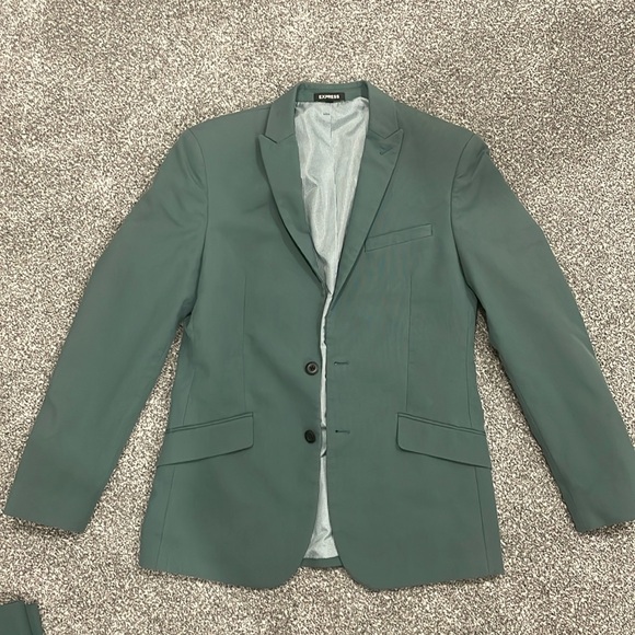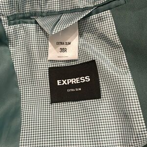 Express Suit 31x30 extra slim pants, 38R extra slim jacket. Slight discoloration on left shoulder. (Should come out in wash.)
