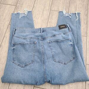 These Express mom jeans feature a flattering super high-rise fit with a classic light wash and effortless distressed detailing. The ripped knee and raw, frayed hems give them a relaxed, on-trend look perfect for everyday wear. Made with a soft, stretchy blend for comfort while maintaining that vintage-inspired structure.