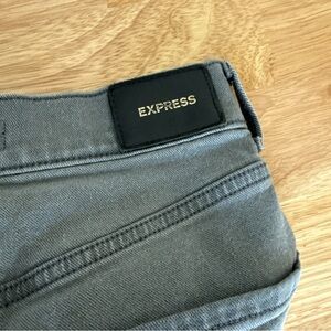 The product is a pair of Express Super High Rise Mom Jeans in Women's Size 00. Made from a blend of polyester, spandex, and cotton, these jeans feature a high rise cut and a 5-pocket design. The gray color and stretch material make them comfortable and versatile for everyday wear. Machine washable for easy care, these jeans are perfect for a trendy and everyday look for any woman's wardrobe.