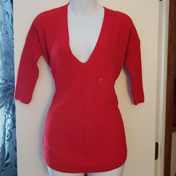 BRAND NEW with tags. Size XS. Longer in the back then the front. Quarter length sleeves. Body of the sweater is a looser fit while the sleeves are a tight fit. Lower cut v-neck. True red color.