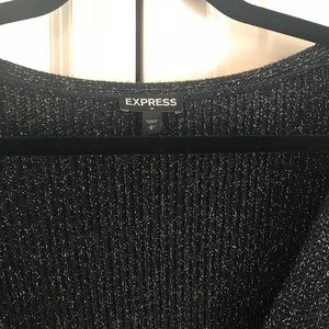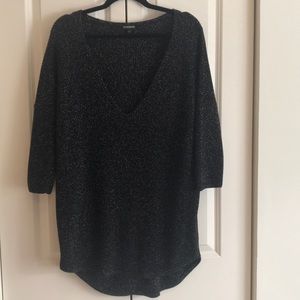 Large. 3/4 Sleeves, black with gold sparkle throughout. Soft, stretchy fabric. Falls below my backside and I am 5’6. Very comfortable and loose.