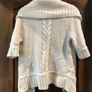 This sweater is adorable! It has six buttons on the front, shorter sleeves (hits above elbow), and has a chinky knit. It is in excellent used condition. Please let me know if you have any questions. Color is off white.