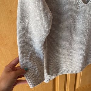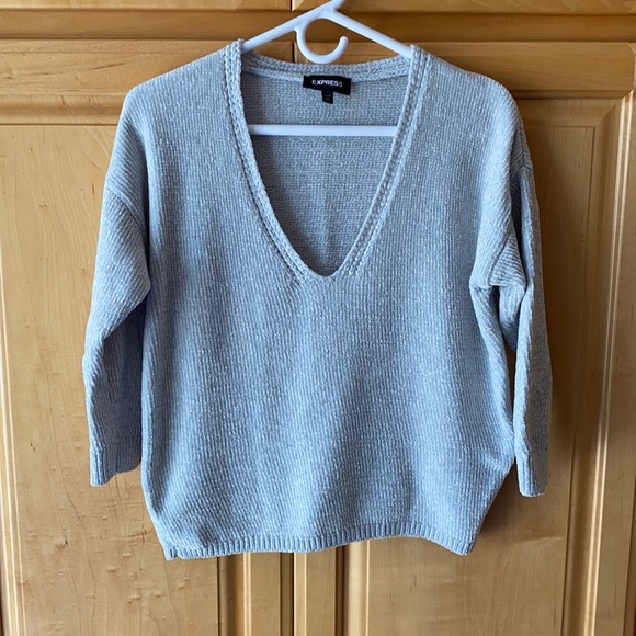 Brand: Express Size: XS Color: Gray • mix between a v-neck and scoop neck • super soft material —- fuzzy