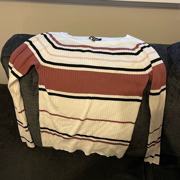 Ribbed, crew neck sweater. Cream color with black, brown, and pink stripes.