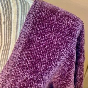 Purple / Plum Colored Chenille-feel Fabric with a Deep V-Neck and 3/4 Length Sleeves. Wider, slouchy fit.
