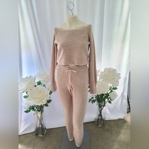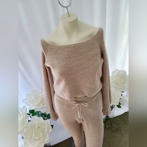 Express - Pecan shade Sweater Set. Crop top can be worn on or off shoulder in a size small. Sweater pants in size x-small have pockets and a tie waist. Beautiful condition - Very cozy!