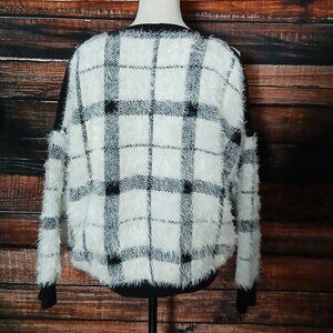 Express Sweater XS Slit Shoulder Black White Plaid Fuzzy Eyelash Knit