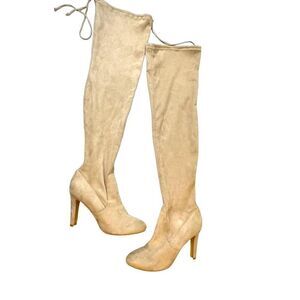 Express "TISSU" Ultra High Heel Boots Tan Over The Knee Women's Stretch Size 9