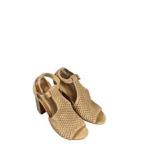 Express Tan Faux Suede Perforated Open Toe Ankle Strap Block Heel Women SZ 6