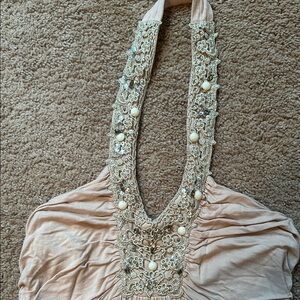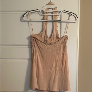 This chic tank top from Express showcases a tan color with intricate ruched detailing and elegant embellishments. The backless design adds a captivating touch, making it perfect for a stylish outing.