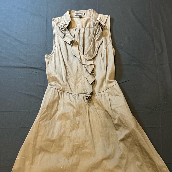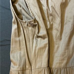 Chic tan midi dress with ruffle neckline. Sleeveless design. Perfect for versatile styling.