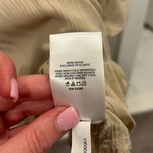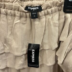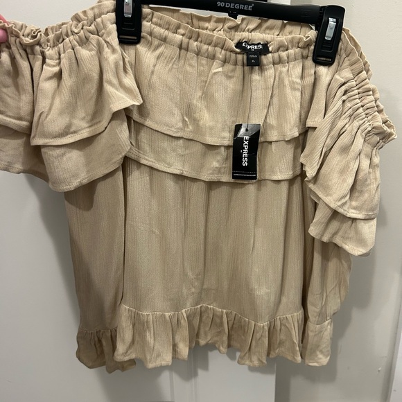 Elegant off-shoulder blouse by Express. Features layered ruffles in a soft tan shade.
