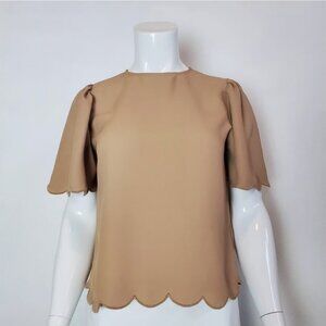 Express tan crew-neck short-sleeved blouse with flutter sleeves, keyhole and button closure in back, and scalloped hem and sleeves.