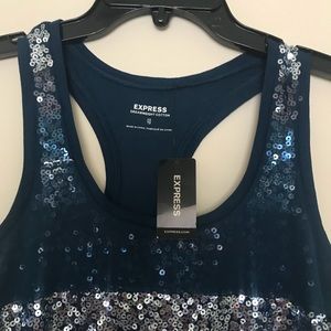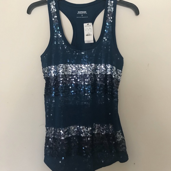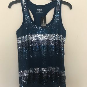 This is a blue tank top with sliver, black and blue sequins.