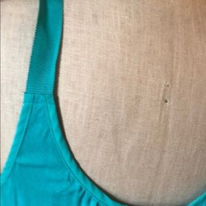Express tank in a greenish turquoise color. The front is kind of sheer and zips. The back is a soft, T-shirt fabric. It’s loose and short. Like new.