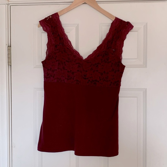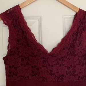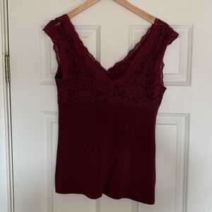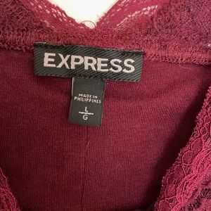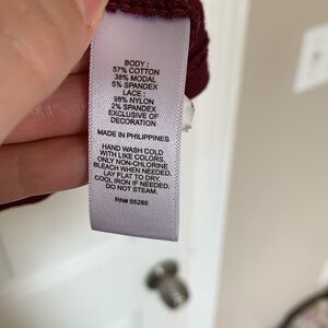 Lace detail with sleeves having an off the shoulder effect. Pairs well with a strapless bra. Plum color.