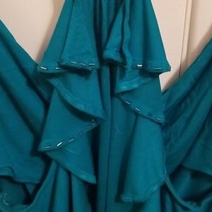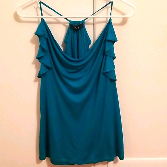 This tank is gorgeous! Rhinestone detail on the flutter sleeves. 100% rayon. A greenish blue color.