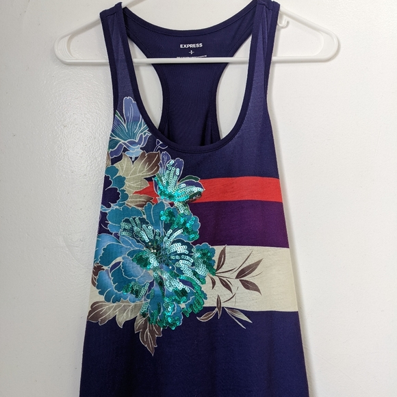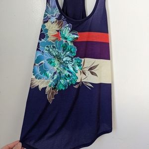 Flowy, rich purple tank with beautiful contrast stripes and teal sequin flower detail. Only worn a few times. No flaws. Excellent pre owned condition!