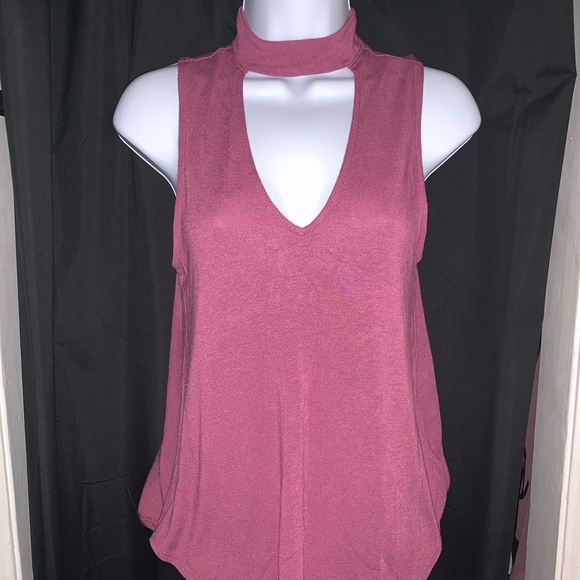 Chocker neck. V neck. Can be worn tucked in or out. Runs large. Loved this top for summer nights with a pair of jeans or shorts
