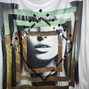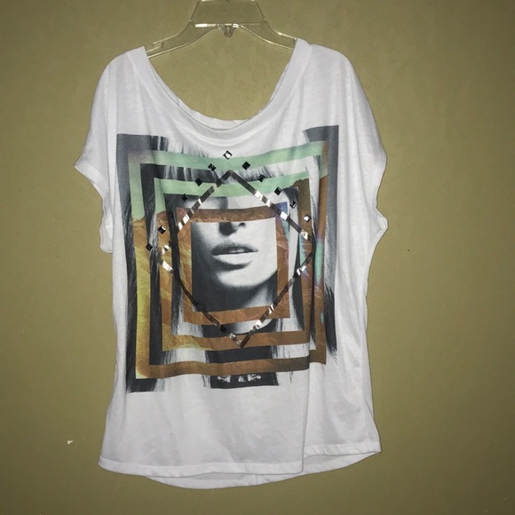 White tee with design on front. Silver lightweight studs on front & cap sleeves. Light & airy! A little fuzzy on the bottom but hardly noticeable.