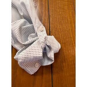 Express The City Shirt Button Down w/ Roll Tab Sleeves Polka Dots is a women's shirt from Express. The white shirt features a collared neckline, a button-down front, and long sleeves with roll-tab accents. It is made from a blend of polyester and viscose, and is described as being a versatile and stylish top suitable for various occasions, including both casual and formal wear.