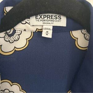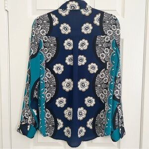 Chic button-down shirt with teal and navy design. Features intricate patterns for a bold look. Ideal for any stylish wardrobe.